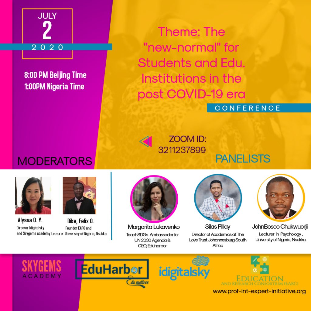 ✌️Join us on the 2nd of July 2020 as we discuss with our panelists- the TeachSDGs Ambassador for UN 2030 Agenda and CEO Eduharbor Margarita Lukavenko; the Director of Academics at the Love Trust Johannesburg South Africa Silas Pillay and Lecturer in Psychology at the University of Nigeria, JohnBosco Chukwuorji. 💪🎉🎁